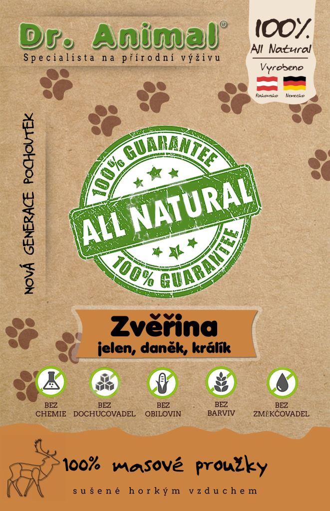 Popis produktu100% Přírodní pamlsek pro psy. Zvěřinové masové proužky obsahují 100% čistého masa (jelen, daněk, králík), nic jiného!. Je to 4A výrobek, což znamená: narozen, žijící, poražen a zpracován v Rakousku.