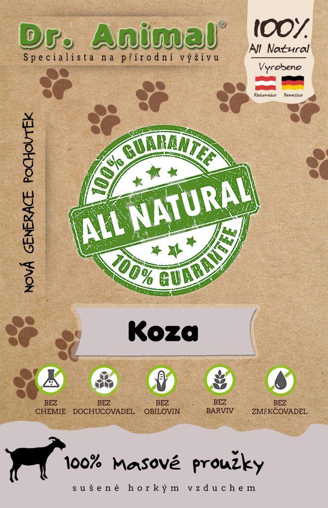 100% Přírodní pamlsek pro psy. Vhodný zejména pro alergiky a citlivé psy. 100g kozí masové proužky obsahují 100% čistého masa, nic jiného!. Je to 4A výrobek, což znamená: narozen, žijící, poražen a zpracován v Rakousku.